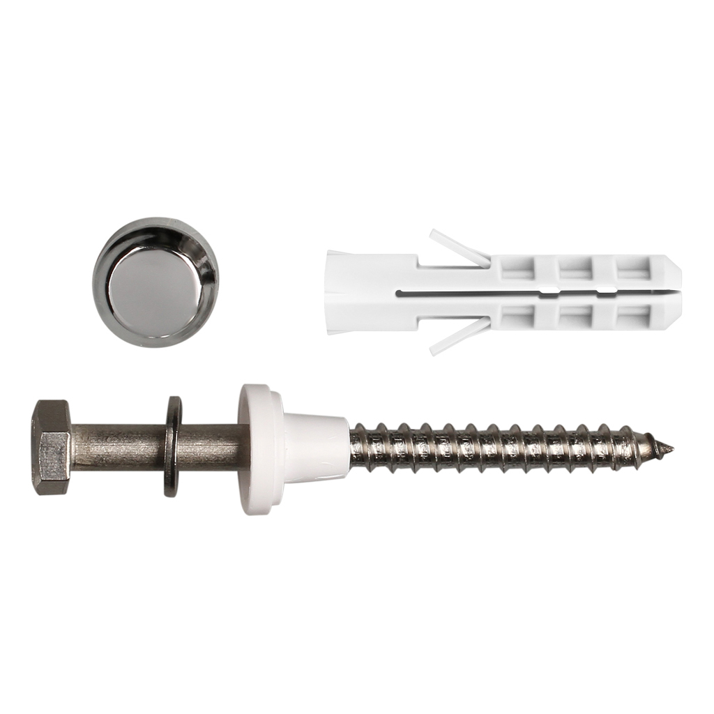 В комплекте PWC: 2 нейлоновых дюбеля, 2 сантех. шурупа, 2 нержавеющих шайбы, 2втулки + 4заглушки (2белых и 2хром)