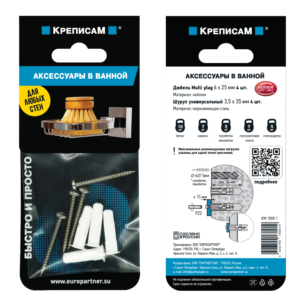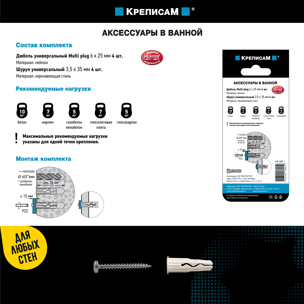 Благодаря универсальному дюбелю MULTI комплект применяется в любом материале основания. Материал дюбеля - нейлон гарантирует долгий срок службы и прочность соединения. Нержавеющий шуруп предохраняет от коррозии во влажных помещениях, обеспечивает легкий монтаж и оптимальные нагрузочные характеристики.