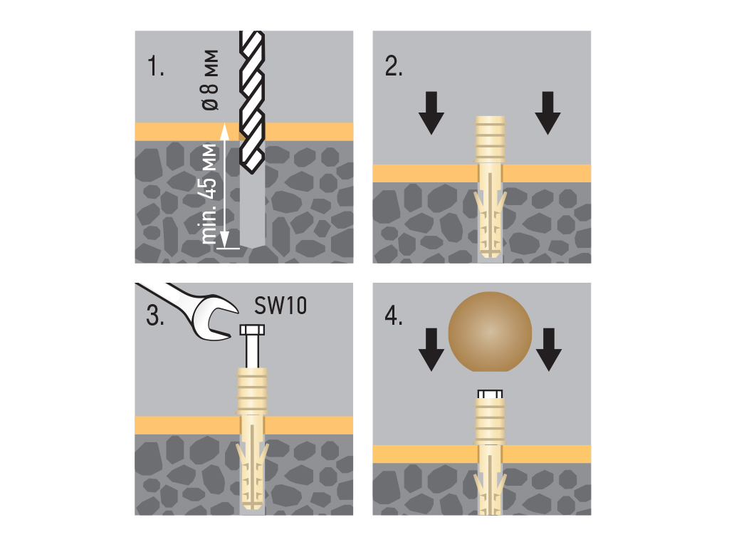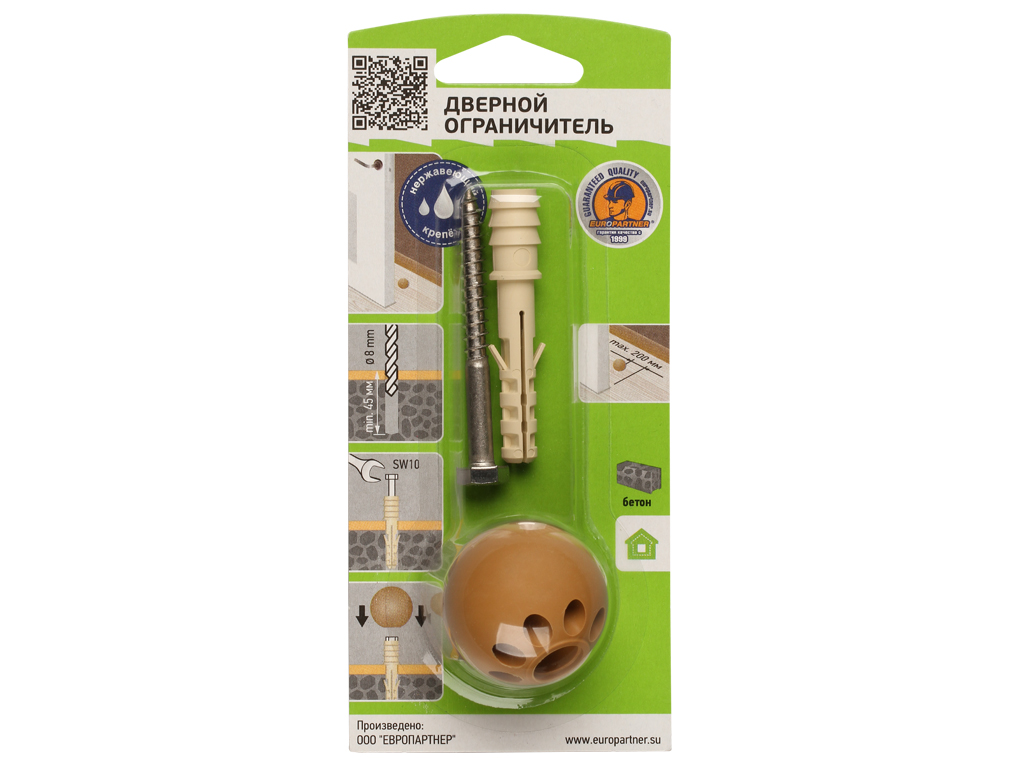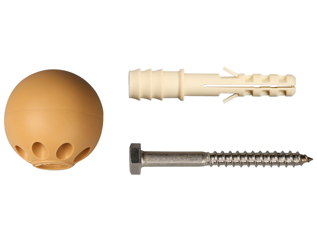 Комплект состоит из нейлонового дюбеля, установочного нержавеющего шурупа и декоративного сферического ограничителя различных расцветок. Ограничитель диаметром 35 мм изготовлен из износостойкого эластомера. Крепление к полу осуществляется при помощи шурупа и дюбеля.