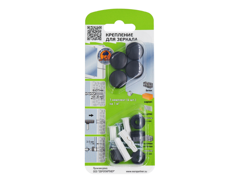 Входящий в комплект универсальный дюбель позволяет закрепиться в любые материалы основания. Один комплект крепления рассчитан на установку зеркала толщиной до 5 мм и общей площадью до 1 м2.