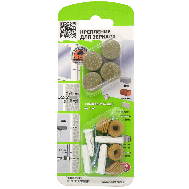 Входящий в комплект универсальный дюбель позволяет закрепиться в любые материалы основания. Один комплект крепления рассчитан на установку зеркала толщиной до 5 мм и общей площадью до 1 м2.